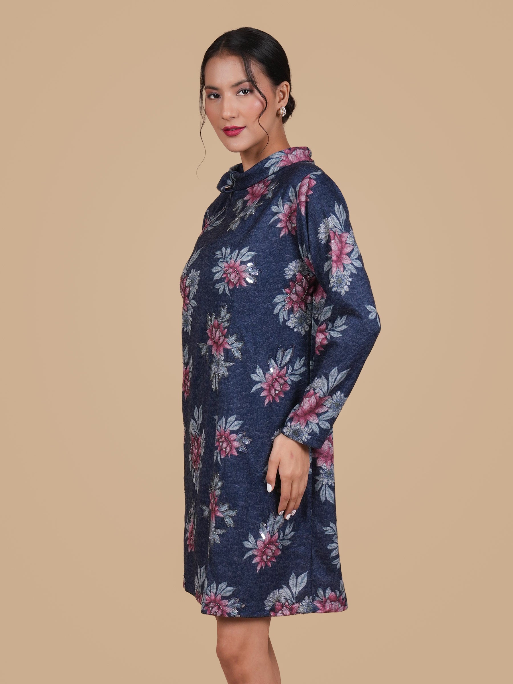 ANGORA DRESS WITH A FLOWER PRINT AND COWL NECK AND LONG SLEEVES.