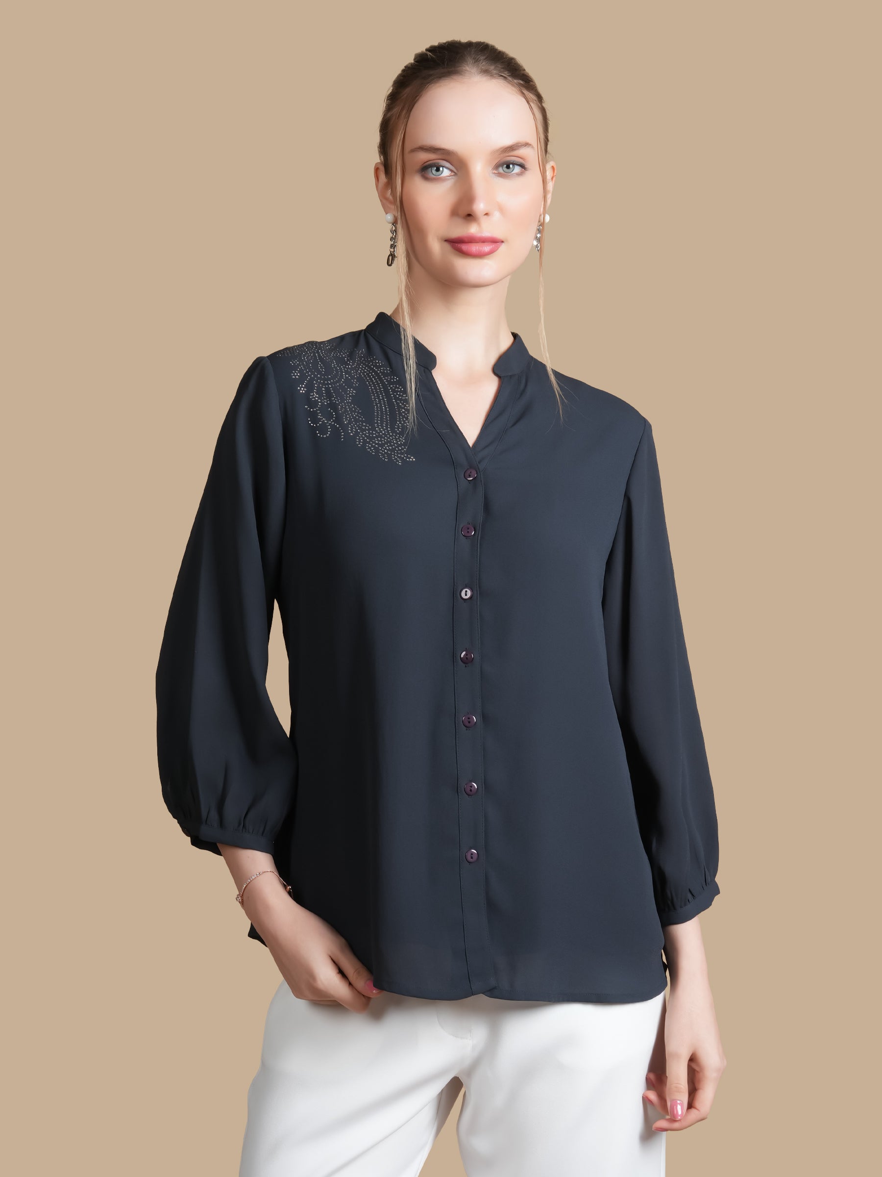 BAND COLLAR V NECK SHIRT WITH LINING INSIDE AND ONE SIDE SWAROSVKI