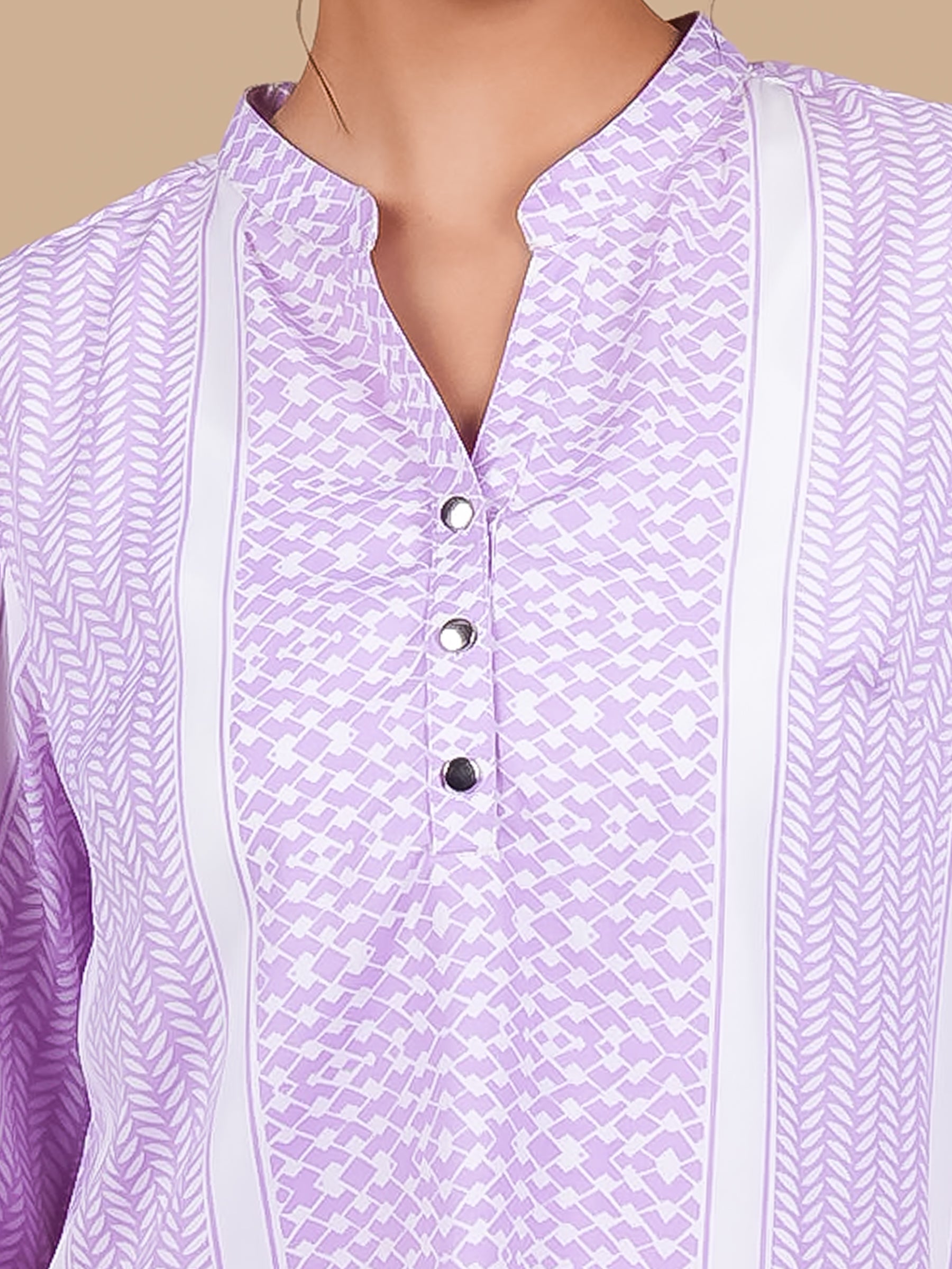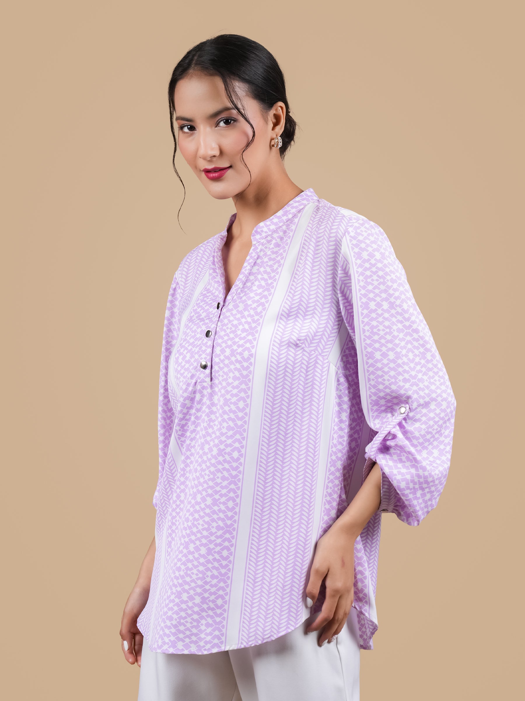 CREPE TOP WITH MADARIN COLLAR AND 3/4TH SLEEVE, HALF BUTTON UP