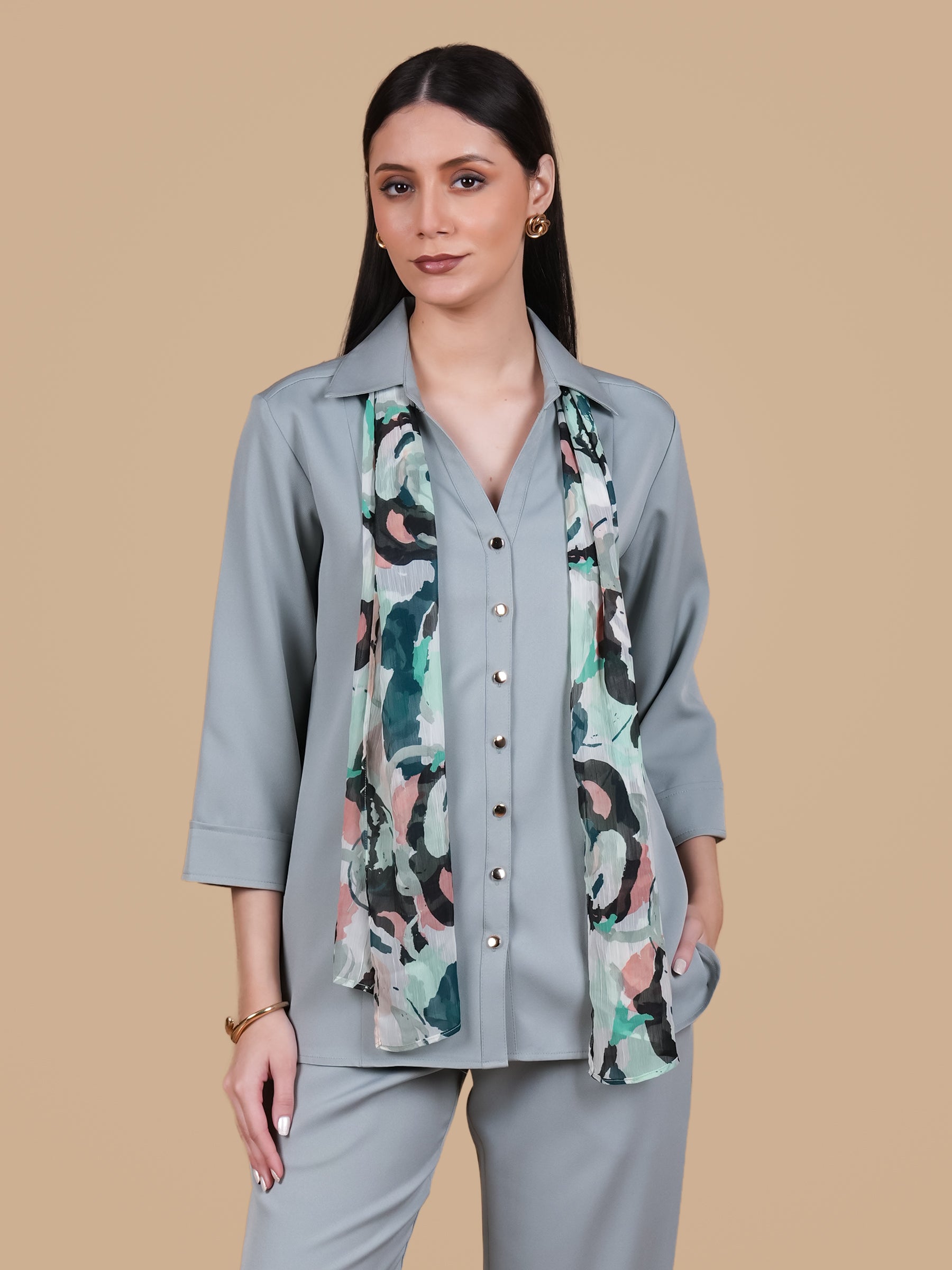 V NECK SHIRT COLLAR COORD SET WITH A SCARF AS AN ACCESSORY,