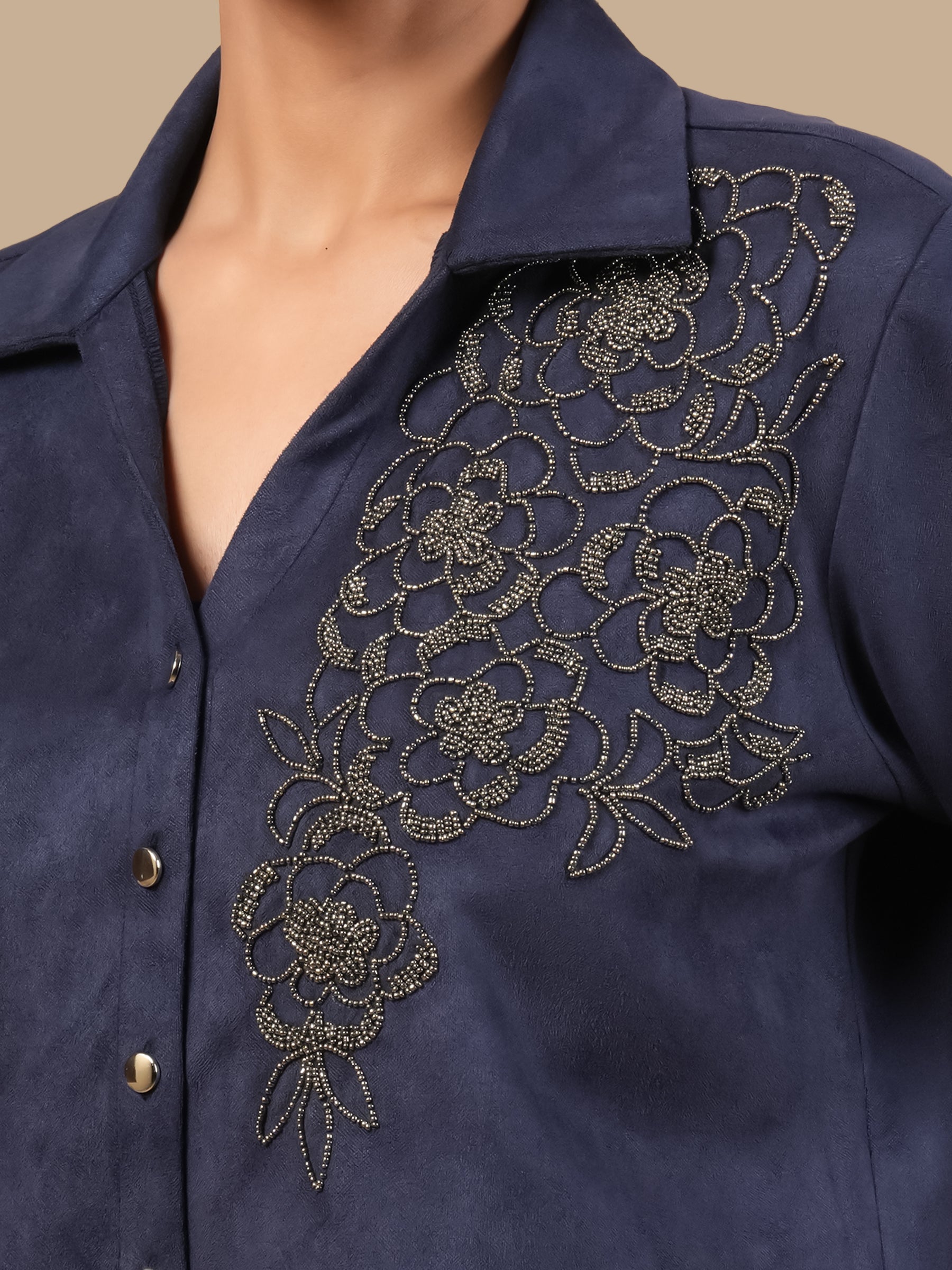 FRONT OPEN V NECK COLLAR SHIRT, WITH BEADS EMBROIDERED ON