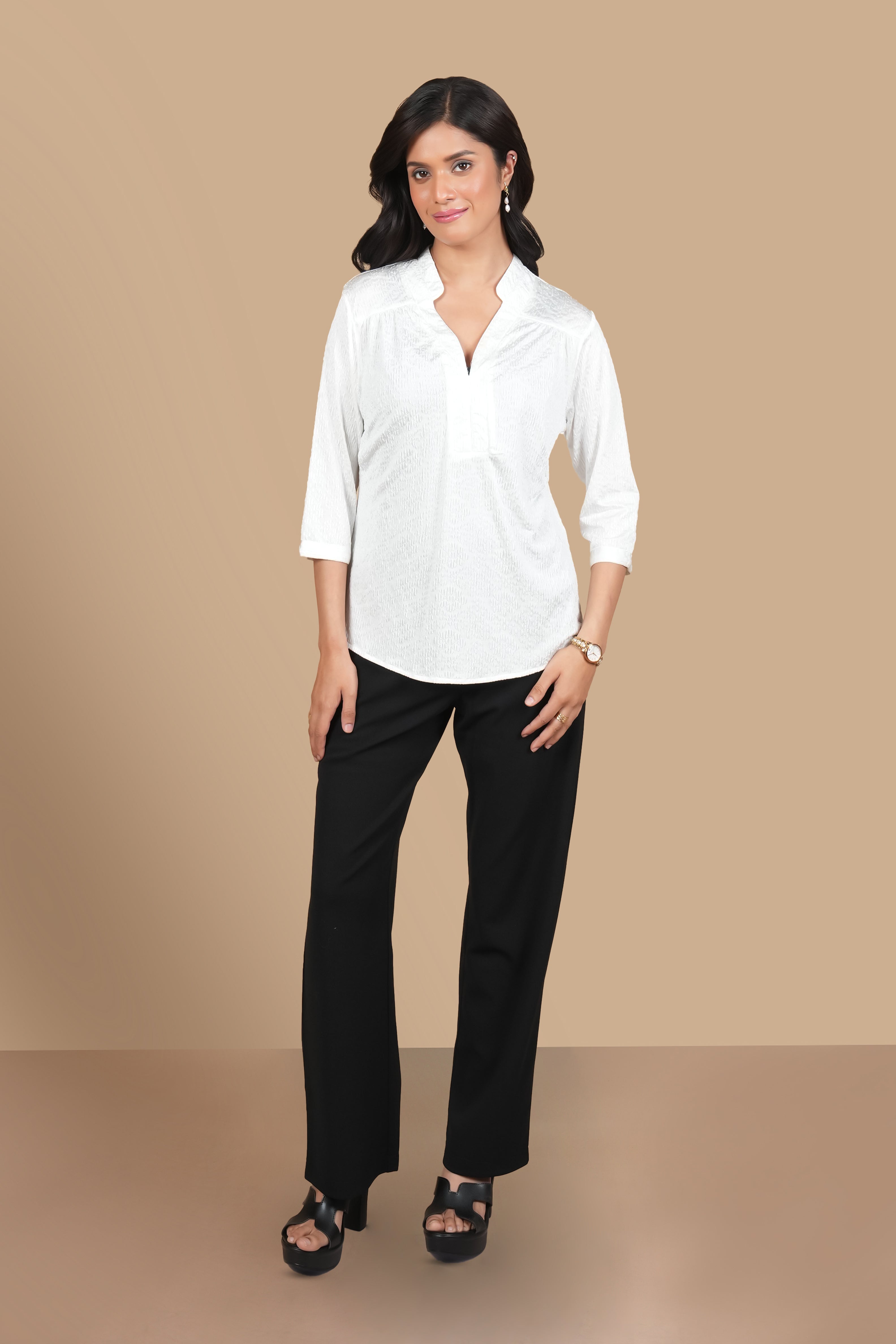 TEXTURED V NECK WHITE TOP