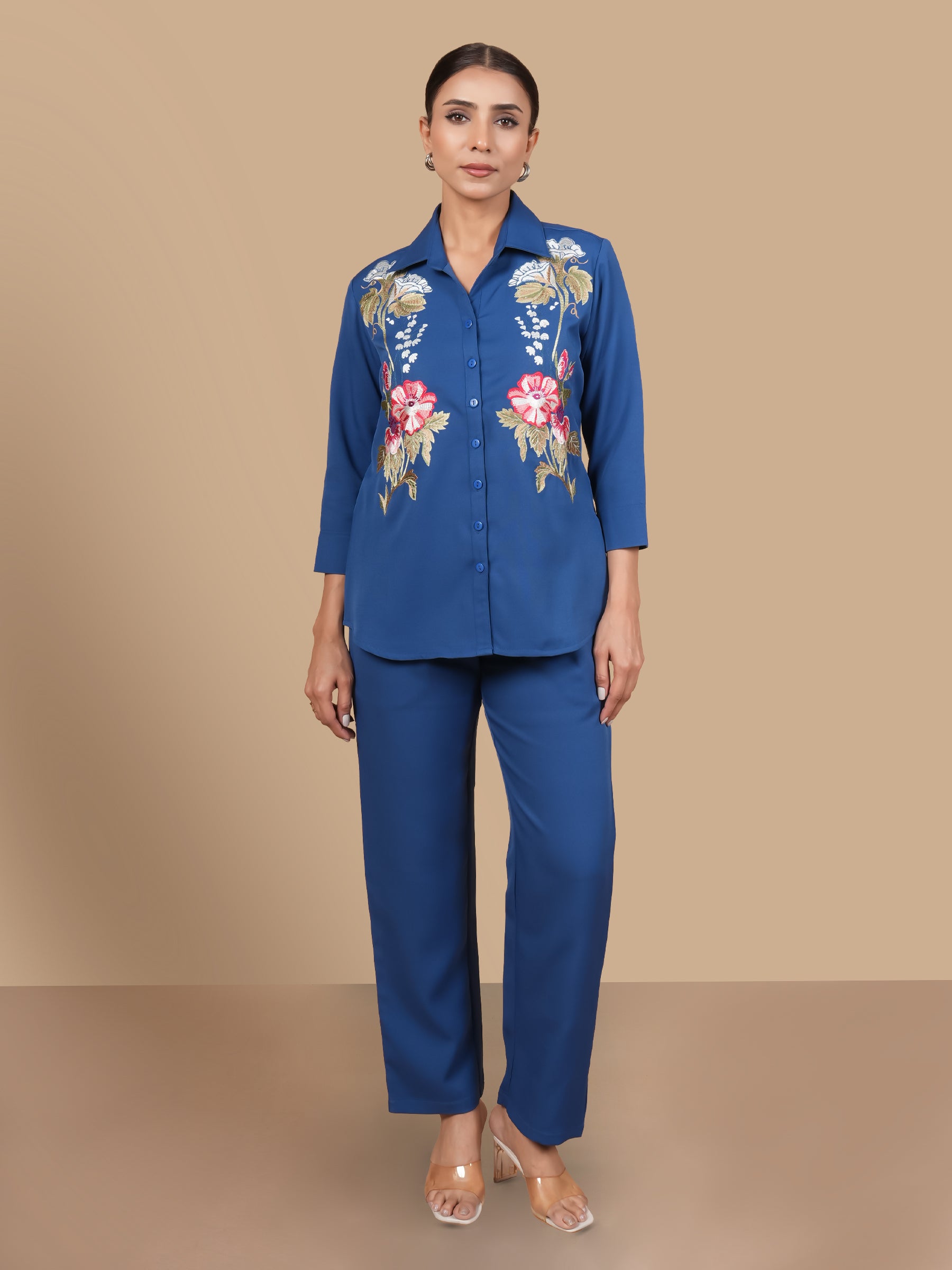 THREE LEAF EMBROIDERED  BLUE COORD SET