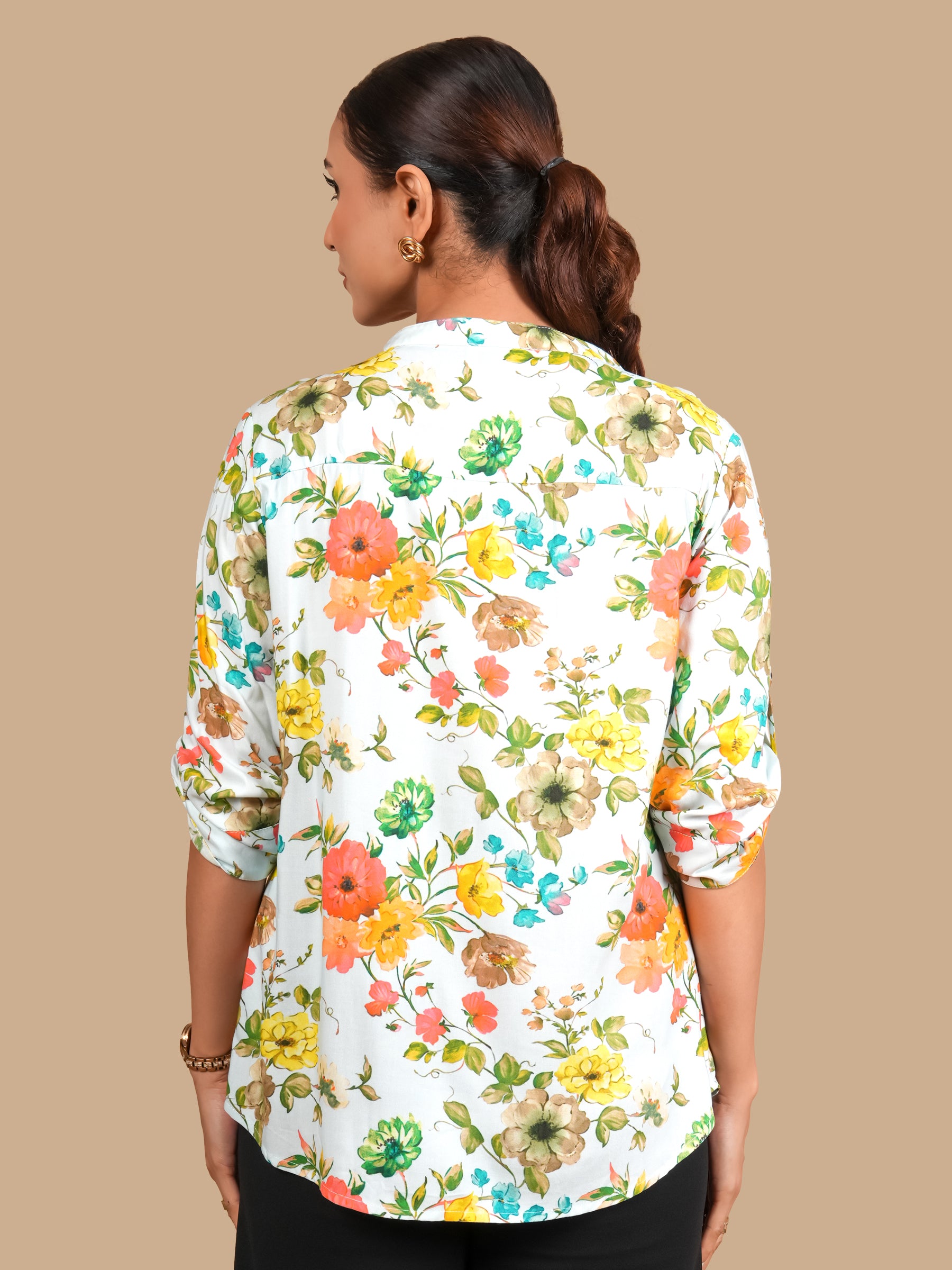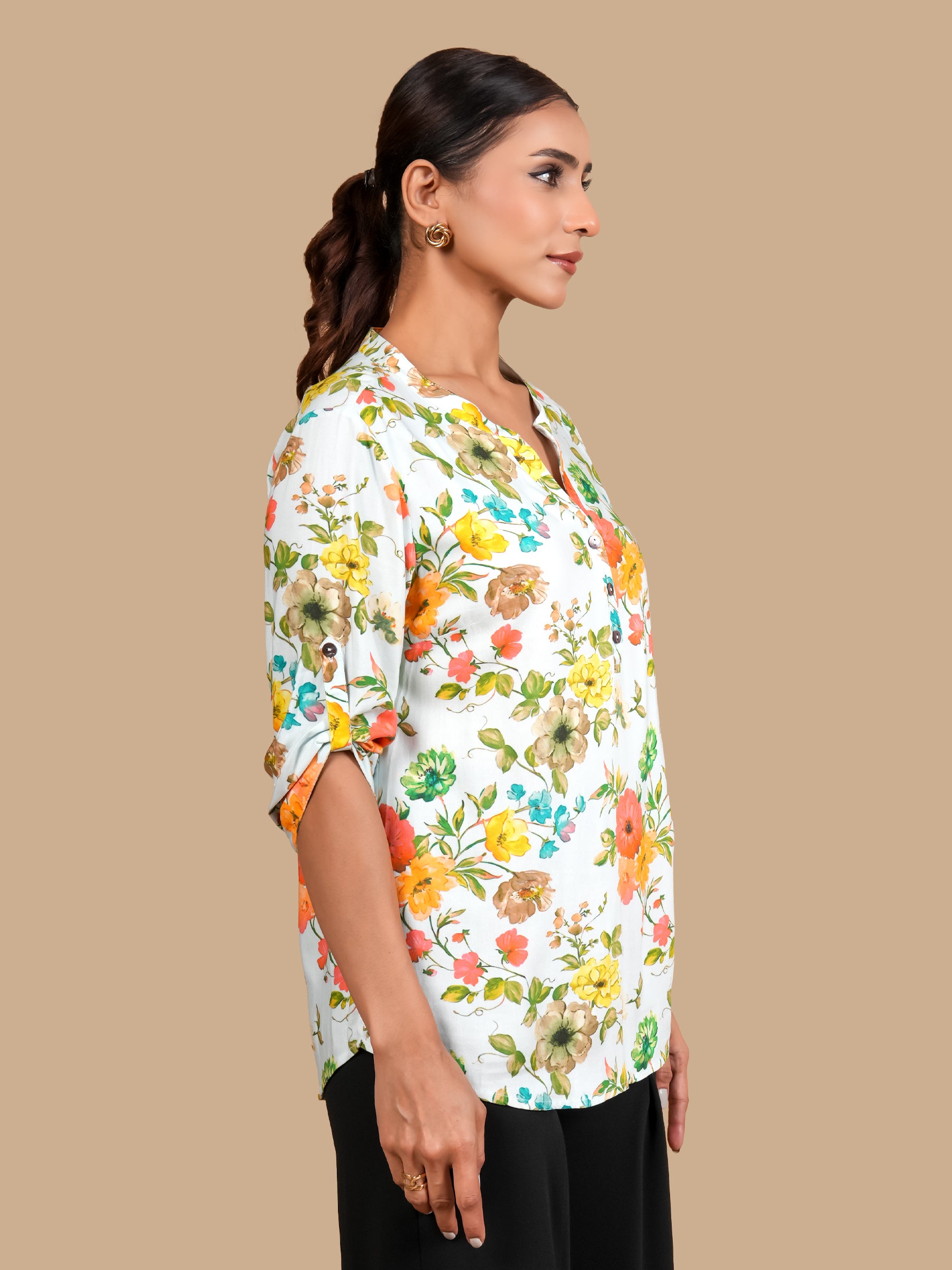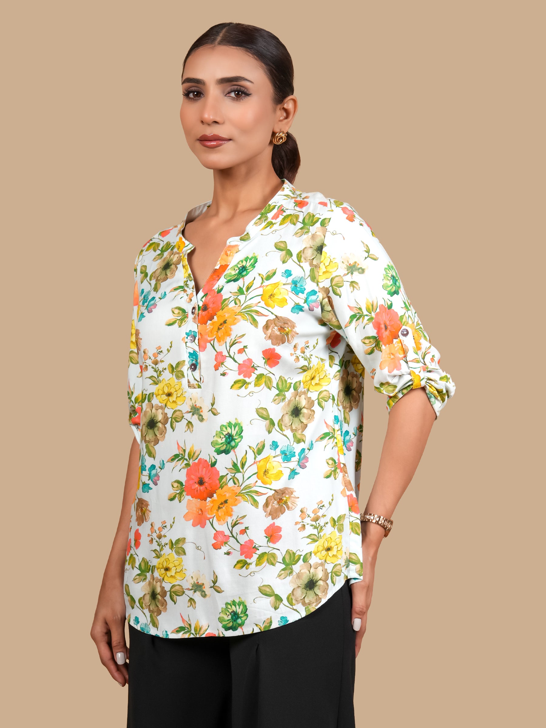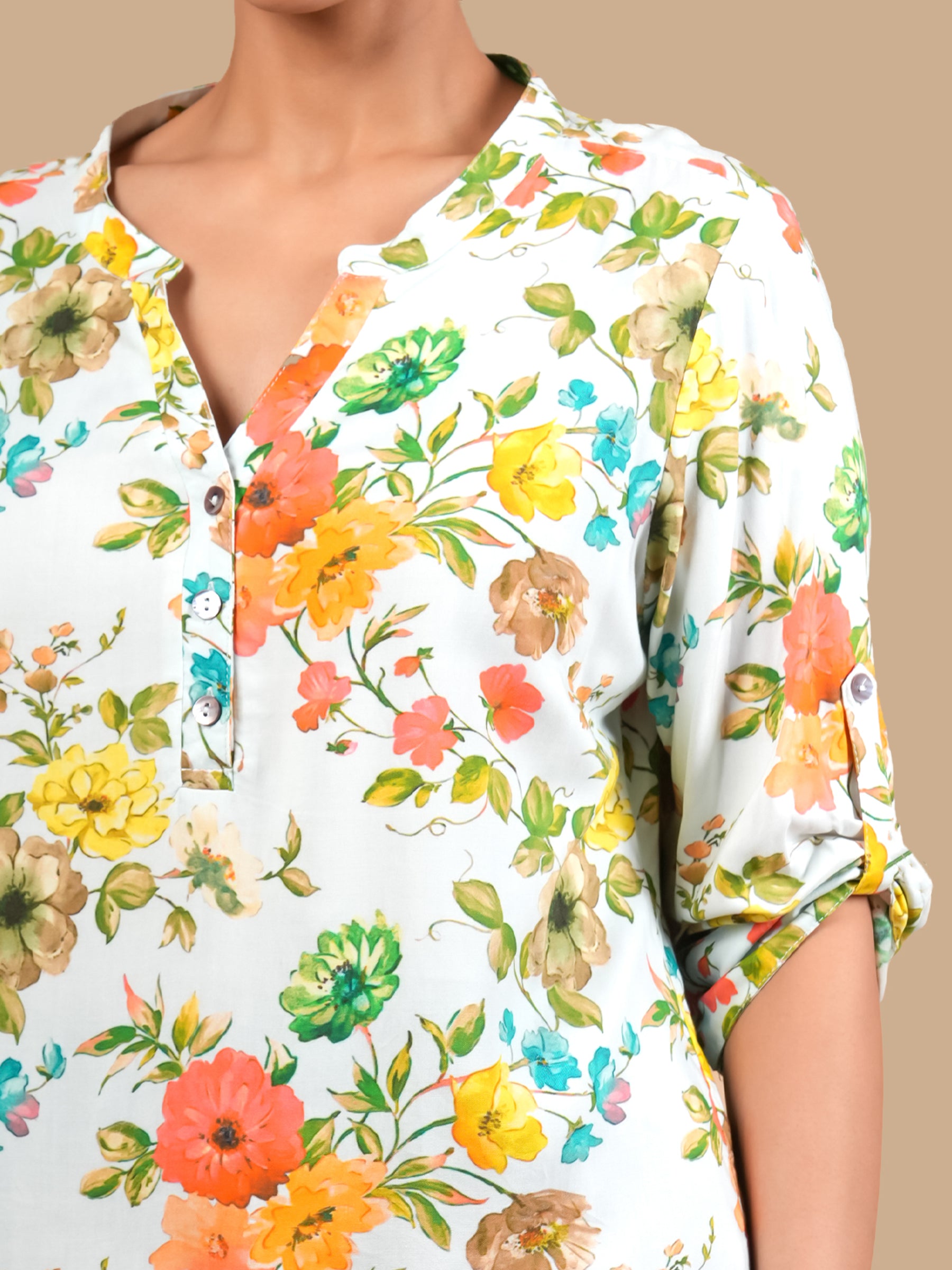 MANDARIN COLLAR HALF BUTTON 3/4TH CUFF TURN UP SLEEVE