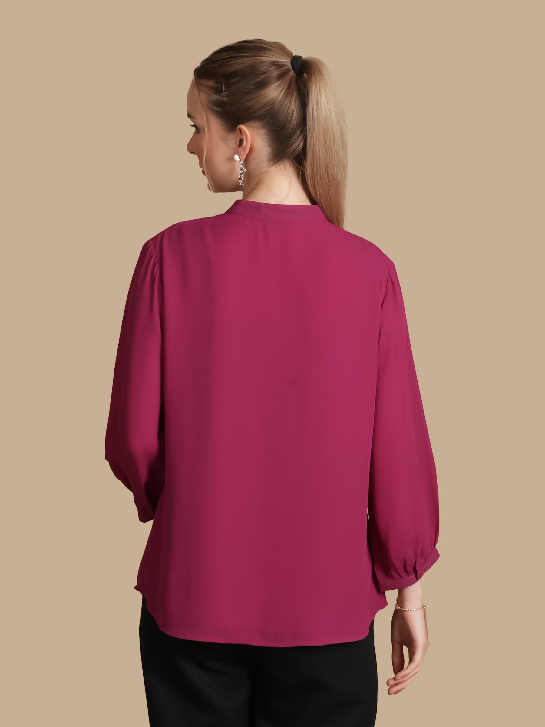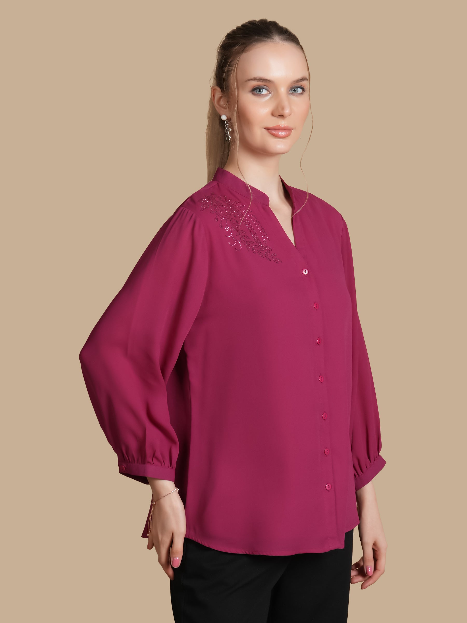 BAND COLLAR V NECK SHIRT WITH SAME TONE SWAROSVKI AND
